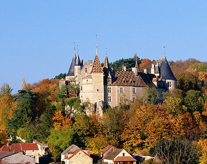 construida sobre el pico rocoso de la Roche-Nolay, esta fortaleza señorial de tejados multicolores ofrece una imagen romántica de la Borgoña ducal