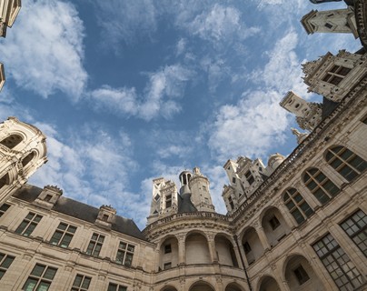 Chambord, grandiosa casa de campo de un rey estimulado por sus sueños, su amor por el arte y la fastuosidad, es única. Delirio arquitectónico delicadamente tallado, con sus torres, sus campanas, su escalera de doble dirección y sus 360 chimeneas. La concepción inicial de Chambord se germinó probablemente en el fecundo espíritu de Leonardo de Vinci.
