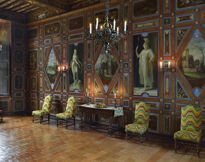 Extraordinary Louis XIII décor (circa 1630). In the Marchioness room, a magnificent French ceiling in gold and blue, with a painting of Venus and Vulcan, work of the second Fontainebleau school, symbolises love. The sumptuous Baroque decor in the Cabinet de Sainte-Cecile is dominated by very blue lapis-lazuli and rich gilding.The Cluny Abbey was before the destructions of the Revolution, the largest Abbey church of all time.